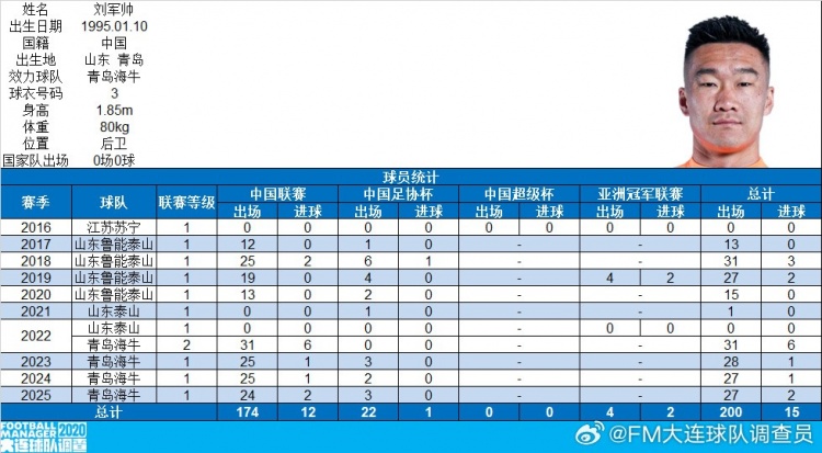 10月18日讯 据博主“FM大连球队调查员”统计,昨天青岛海牛3-4不敌海港的比赛,青岛海牛队球员刘军帅完成了代表中国俱乐部各项职业赛事出场200场里程碑。